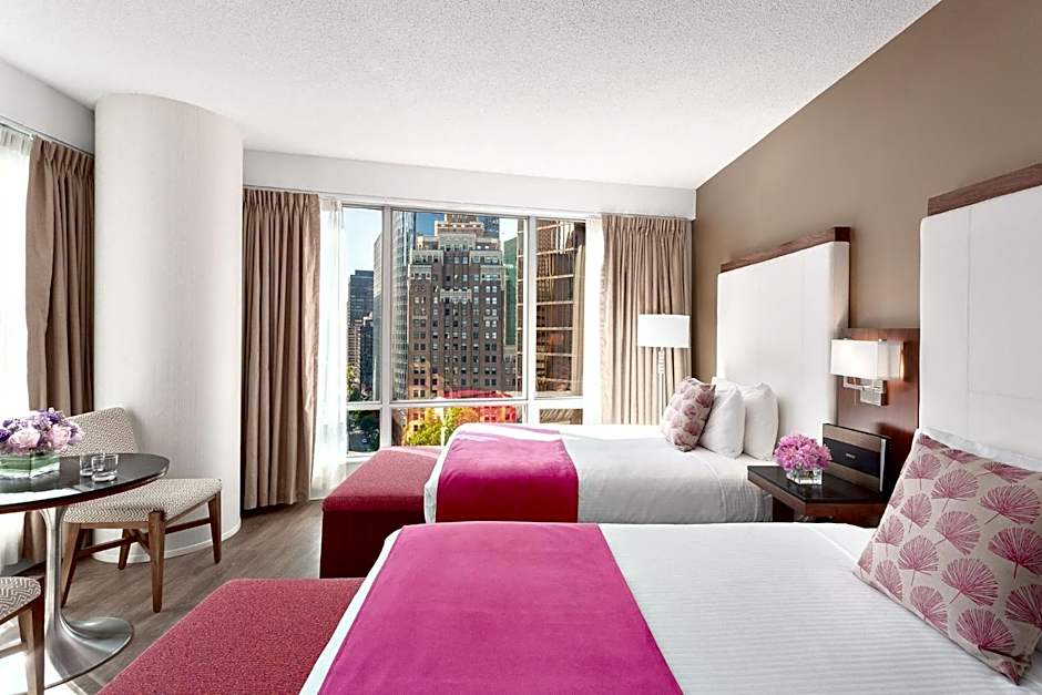 A flat-screen cable TV and a sofa bed are provided in the separate living room in this spacious suite. A mini refrigerator, microwave, Keurig coffee maker, and dining table are included. City views are featured. Free WiFi is included.